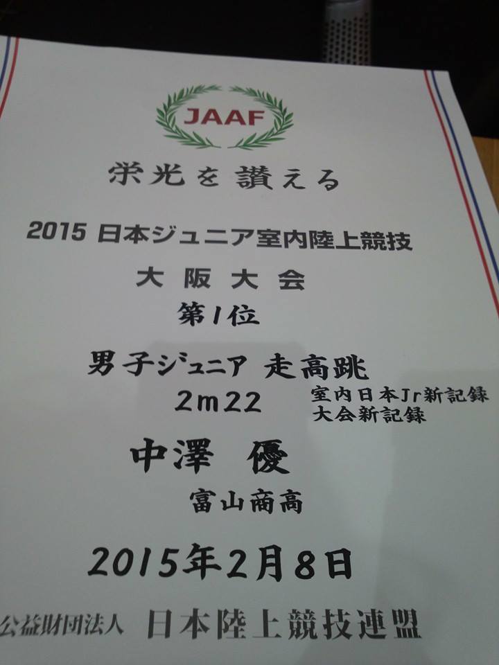 中澤 優 (富山商業3年) 日本ジュニア室内陸上 走高跳優勝 2m22(大会新記録) ついにやりました。おめでとう! インソール製作 by 富山アスリート https://toyama-athlete.com/archives/5312中澤 優 (富山商業3年) 日本ジュニア室内陸上 走高跳優勝 2m22(大会新記録) Posted on 2015年2月10日2015年10月15日 by nakamura Categories: アスリート向け(その他)